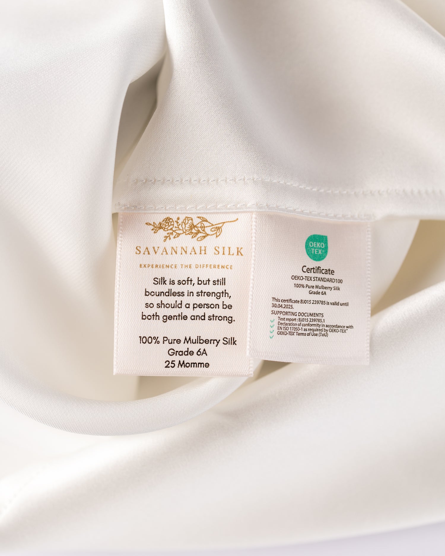 For å gi våre kunder en ekstra kvalitetssikring gjennomgår våre produkter en OEKO-TEX® Standard 100-sertifiseringsprosess, som bekrefter at silken er 100 % fri for skadelige stoffer og trygg for både hud og miljø.